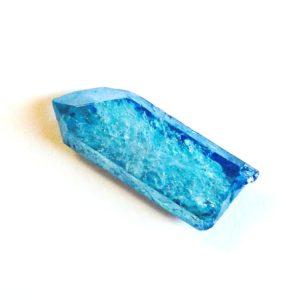 Aqua Aura is a crystal made from the influence of gold fumes on natural quartz. The Gold is heated and its vapor is deposited on the quartz surface giving the crystal its iridescent and shining blue-ish color. These Crystals are used to clean the aura and bring balance in the emotional field.